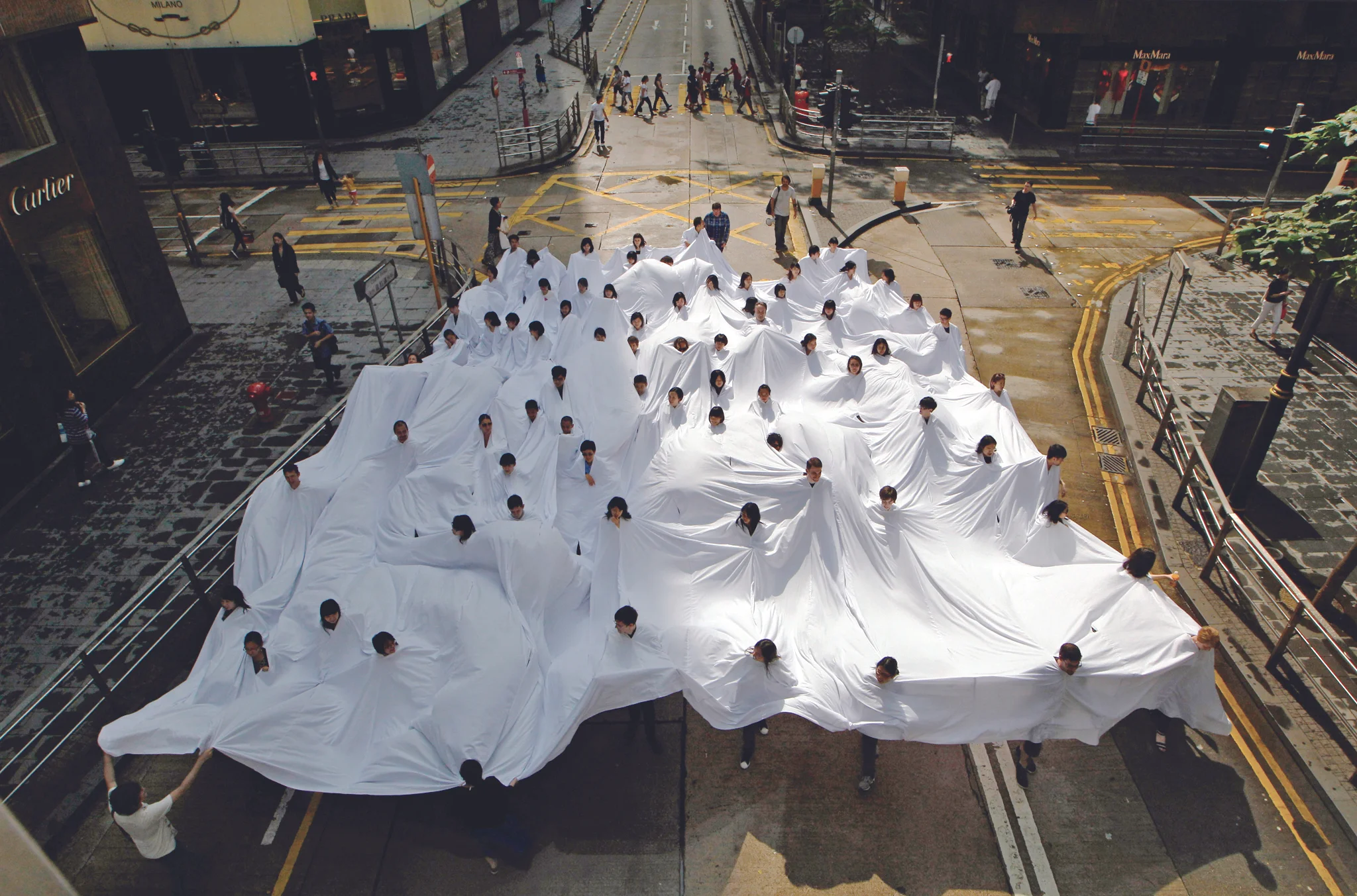Lygia Pape, Divisor (1968 - 2013). Photograph and façade print of a street performance, performed in Central, Hong Kong, 2013.